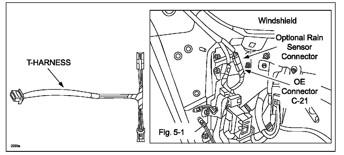 3. To properly connect T-Harness connector to vehicle harness connector, refer to Fig. 5-1 of the EC Mirror Installation instructions for connector location (locate OE connector (C-21) under driver side dash, near A-pillar).