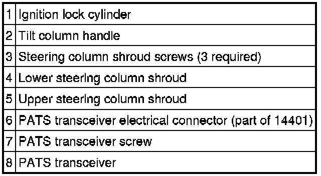 NOTE:Replacement of the PATS transceiver does not require the PATS keys to be programmed into the instrument cluster again.To install, reverse the removal procedure.