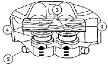2 Apply low air pressure to the fluid port in the disc brake caliper.