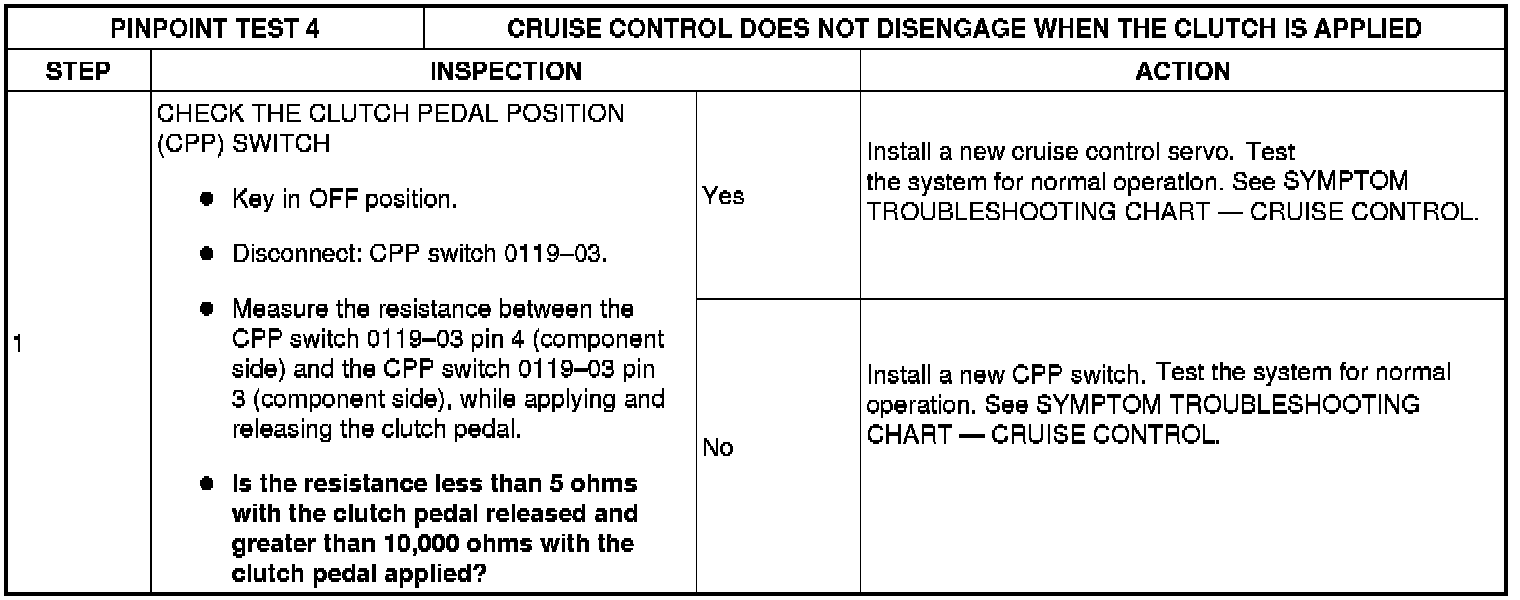 SYSTEM PINPOINT TEST 4: CRUISE CONTROL DOES NOT DISENGAGE WHEN THE CLUTCH IS APPLIED