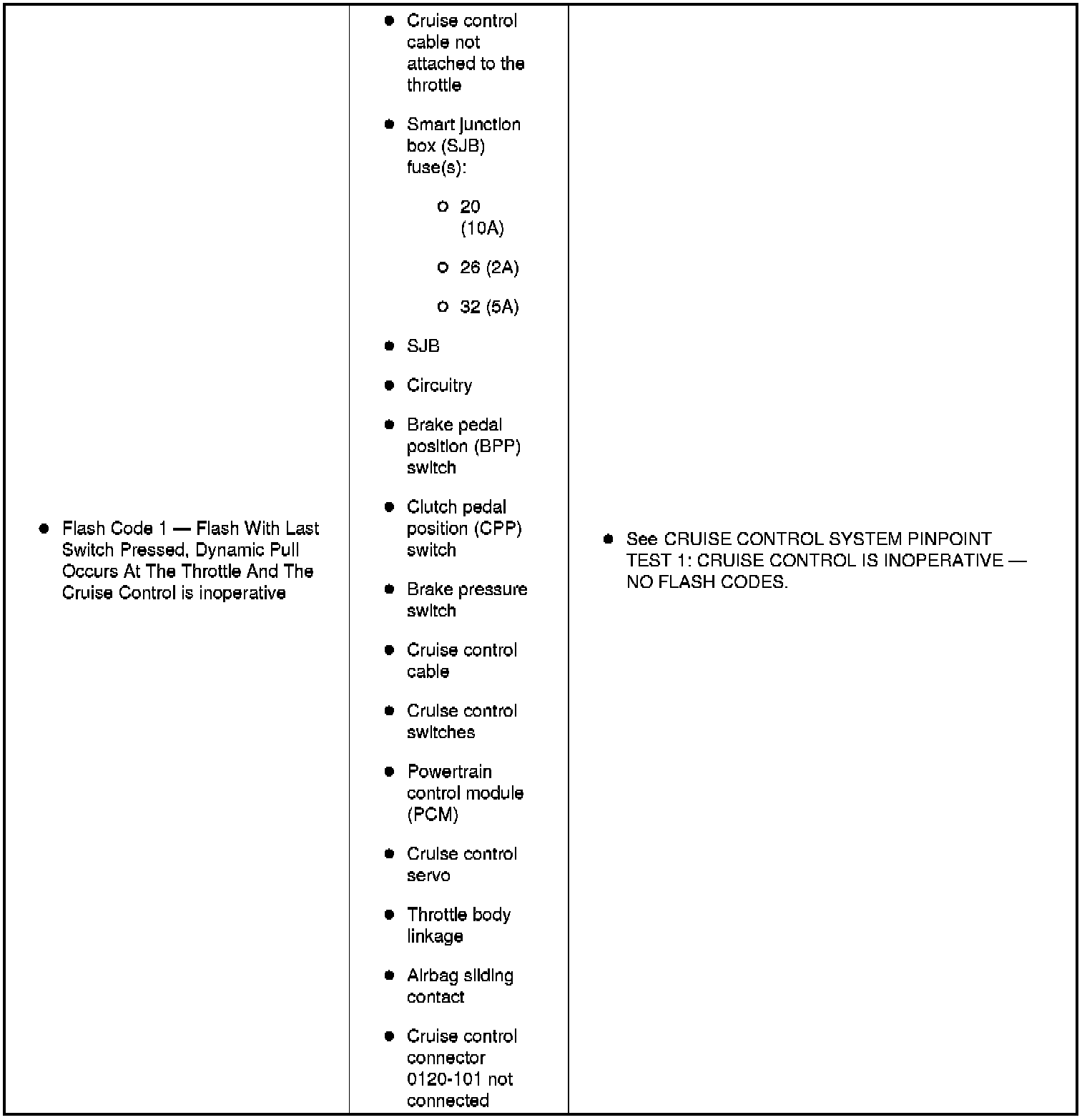 - 2 flashes: The brake pedal position switch is damaged, circuit is damaged, or brake pedal is applied: clutch pedal position (CPP) switch is damaged, circuit is damaged, or clutch pedal is applied.