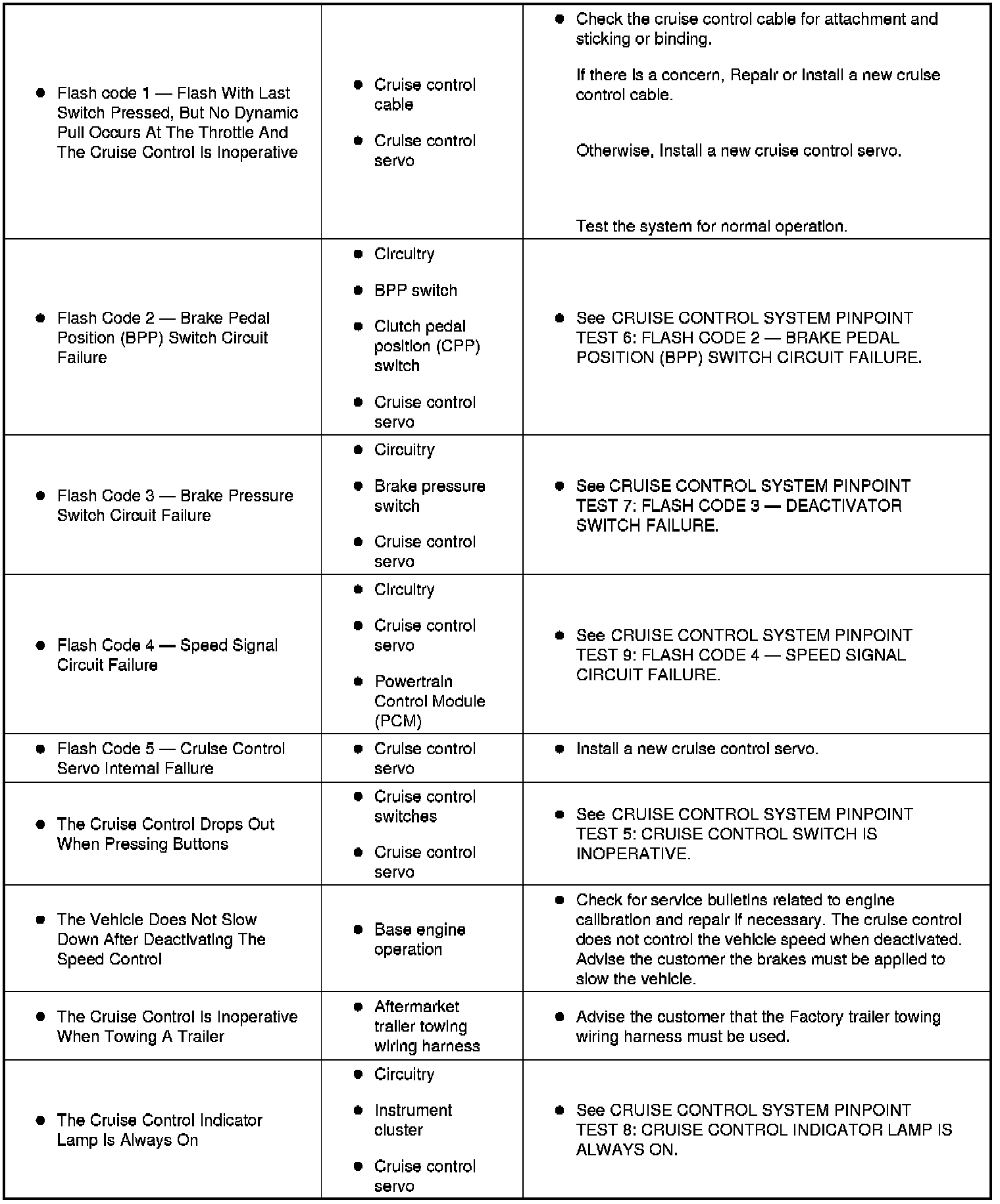 NOTE:There will be a slight delay from when the last button is pressed and the lamp flashes diagnostic codes. If the self-test will not start or can not be completed after multiple attempts, Go to Symptom Troubleshooting Chart - Cruise Control.Follow the list below for diagnostic flash codes, then Go to Symptom Troubleshooting Chart - Cruise Control.