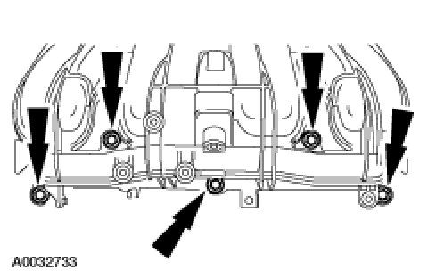 CAUTION:Do not use metal scrapers, wire brushes, power abrasive discs or other abrasive means to clean the sealing surfaces. These tools cause scratches and gouges which make leak paths. Use a plastic scraping tool to remove all traces of old sealant.Remove the 5 bolts and the intake manifold.