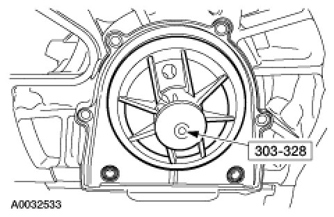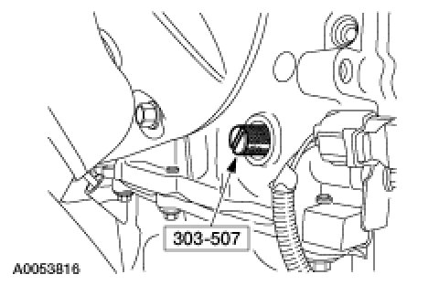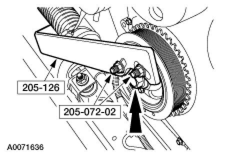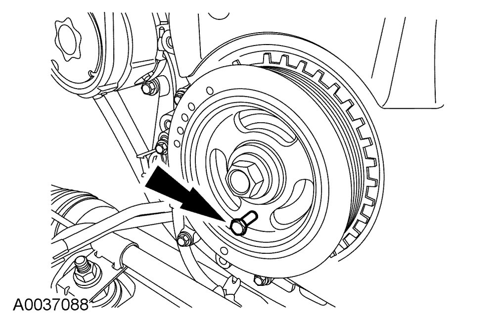 NOTE:Installing the crankshaft TDC timing peg SST in this step will prevent the engine from being rotated in the clockwise direction. However, the engine can still be rotated in the counterclockwise direction.