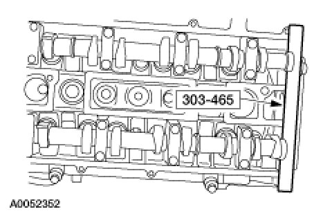 CAUTION:The camshaft alignment plate SST is for camshaft alignment only. Using this tool to prevent engine rotation can result in engine damage.Install the camshaft alignment plate SST in the timing slots on rear of both camshafts. Timing slots are offset from the centerline of the camshaft.