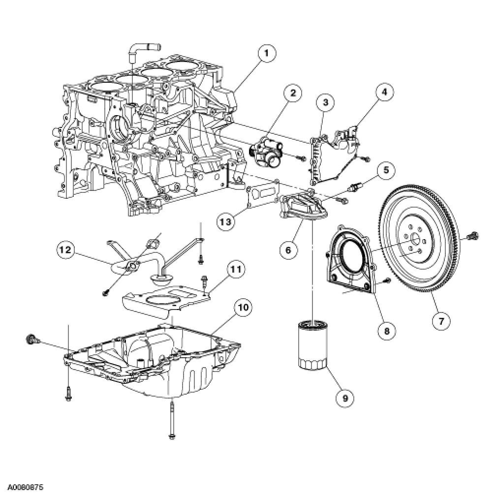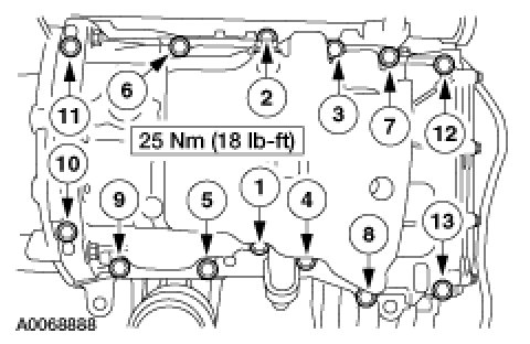 NOTE:If the oil pan is not secured within four minutes of sealant application the sealant must be removed and the sealing area cleaned with metal surface cleaner. Allow to dry until there is no sign of wetness, or four minutes, whichever is longer. Failure to follow this procedure can cause future oil leakage. Apply a 2.5 mm (0.1 in) bead of silicone gasket and sealant to the oil pan. Install the oil pan. Tighten the oil pan bolts in the sequence shown.