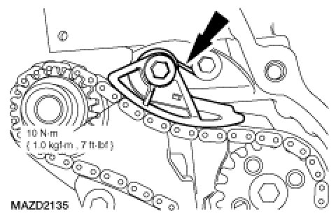 1. Install the oil pump chain tensioner. Hook the tensioner spring around the shoulder bolt.