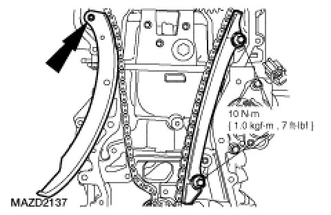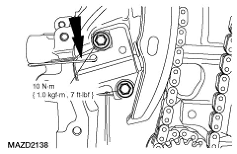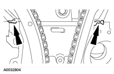 1. Install the timing chain tensioner. Remove the paper clip to apply tension to the timing chain.