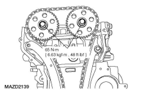 NOTE:Use a wrench on the flats between cylinders No. 1 and No. 2 to hold the camshafts in place.Tighten the camshaft sprocket bolts.