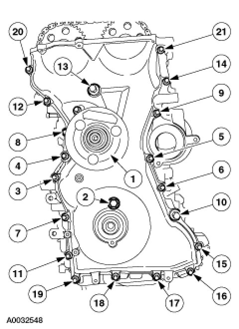NOTE:The front cover must be secured within four minutes of silicone gasket application. If the front cover is not secured within four minutes, the sealant must be removed and the sealing area cleaned with metal surface cleaner.Install the front cover. Tighten the bolts in the sequence shown in three stages.
