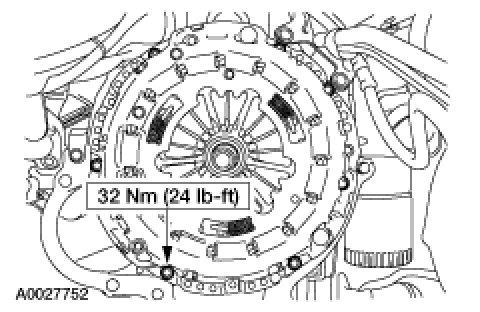 NOTE:If reusing the clutch pressure plate and flywheel, align the marks made during removal.Position the clutch pressure plate and install the bolts. Tighten the bolts in a star pattern sequence.