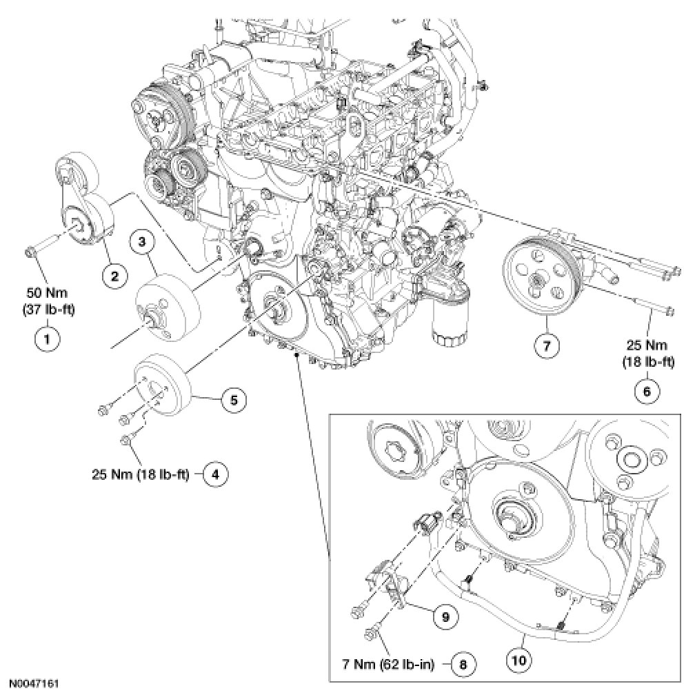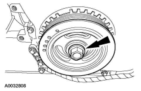 CAUTION:The crankshaft, the crankshaft sprocket and the pulley are fitted together by friction, with diamond washers between the flange faces on each part. For that reason, the crankshaft sprocket is also unfastened if you loosen the pulley. Therefore, the engine must be retimed each time the damper is removed. Otherwise severe engine damage can occur.Remove the crankshaft pulley. See - Service and Repair.
