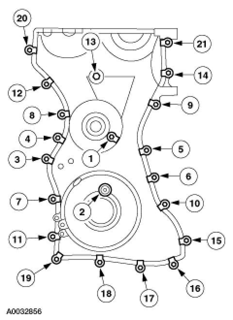 Install the front cover. Tighten the bolts in the sequence shown, to the following specifications:Tighten the 8 mm bolts to 10 N-m {1 kgf-m, 7 lbf}.