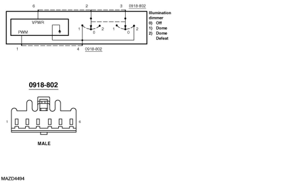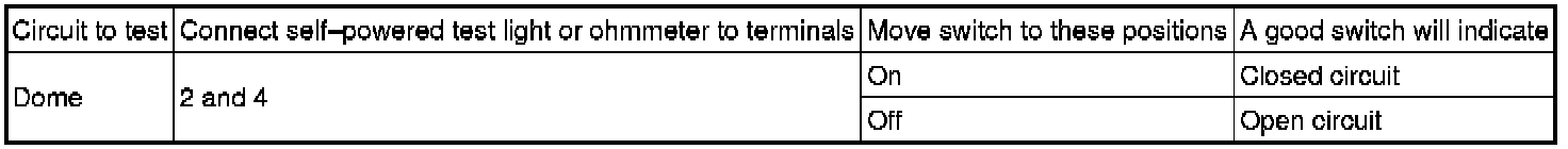 Component testing procedure (voltage applied)Disconnect the ohmmeter; connect pin 2 using a fused (10A) jumper to 12V DC power and pin 4 to ground. Measure the voltage between pin 2 and pin 4 while rotating the thumbwheel from full illumination to no illumination. If the voltage smoothly decreases from near 12 volts to near 0 volts, the illumination dimmer is OK.