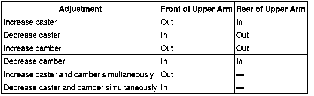 NOTE:The vehicle should be supported by the lower arms to ease movement of the upper arm in the slot.To adjust the caster and camber refer to the following chart.