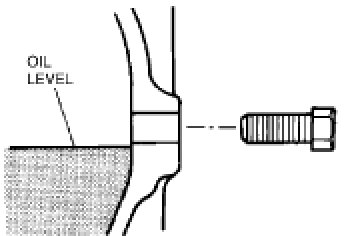 Remove the oil level plug with washer and add the specified amount and type of oil through the oil level plug hole. The fluid must be just below the fill plug hole.