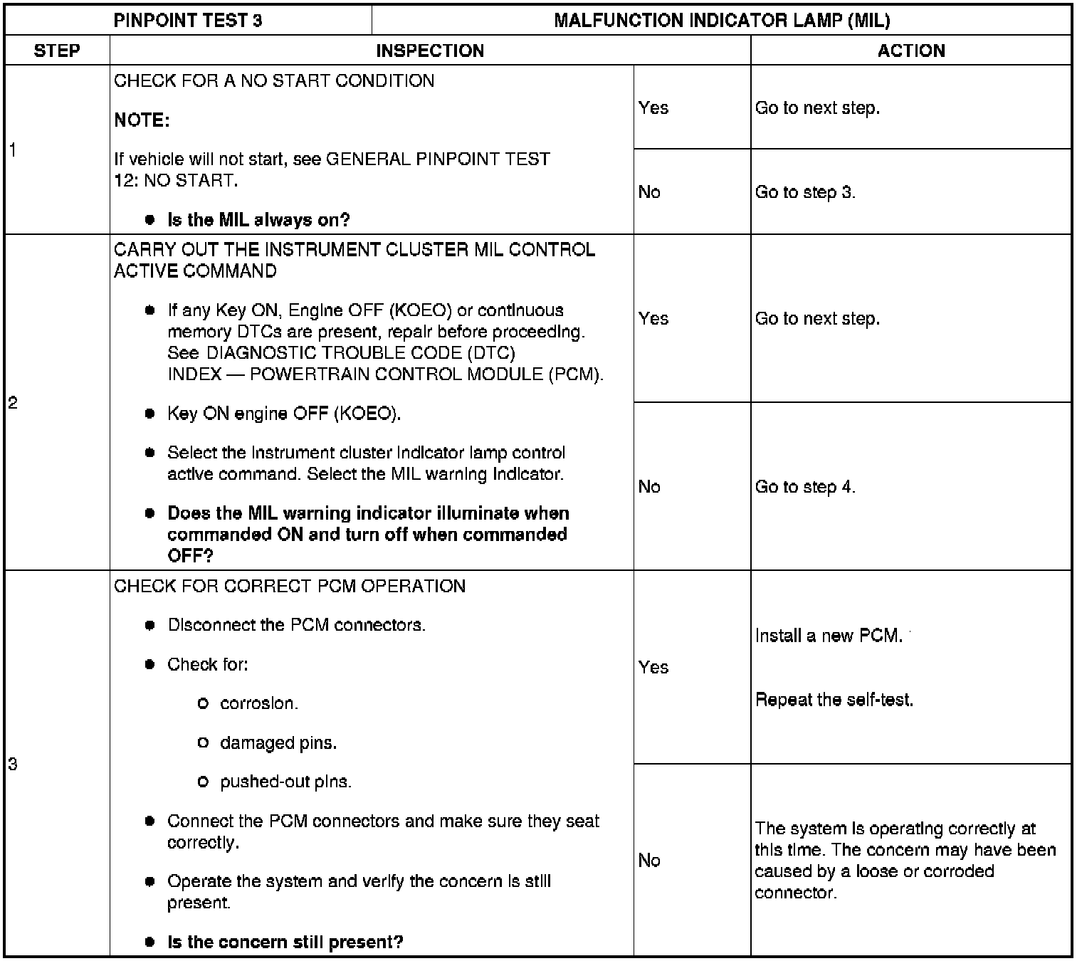GENERAL PINPOINT TEST 3: MALFUNCTION INDICATOR LAMP (MIL)