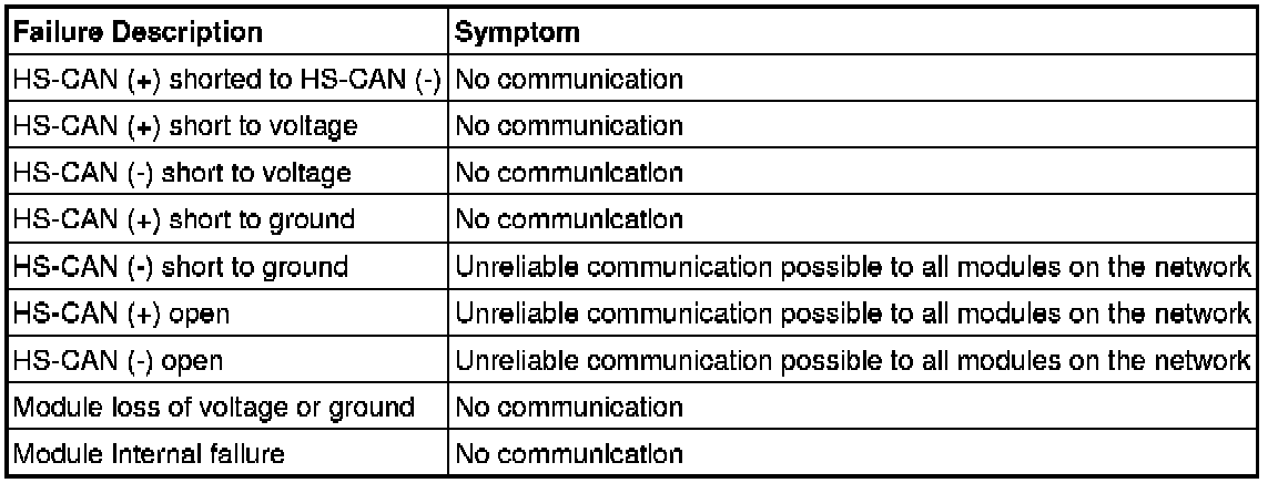 The following fault chart describes the specific HS-CAN network failures and their resulting symptom: