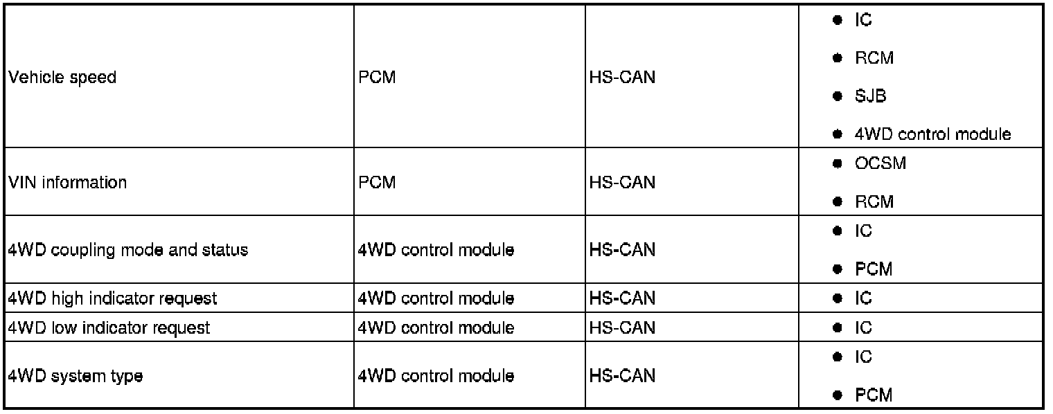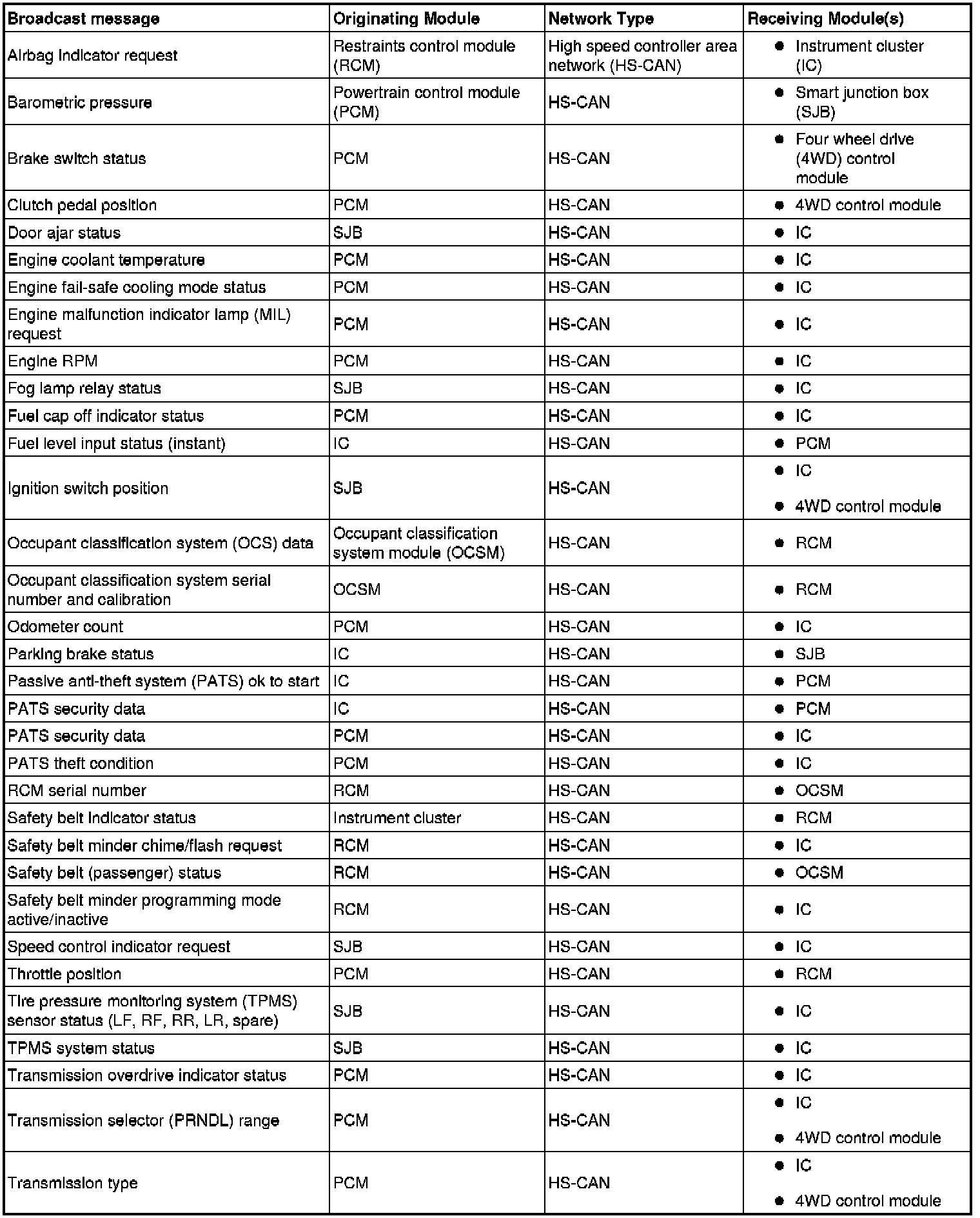 The HS-CAN network uses an unshielded twisted pair cable of data (+) and data (-) circuits. The data (+) and the data (-) circuits are each regulated to approximately 2.5 volts during neutral or rested network traffic. As bus messages are sent on the data (+) circuit, voltage is increased by approximately 1.0 volt. Inversely, the data (-) circuit is reduced by approximately 1.0 volt when a bus message is sent. Multiple bus messages can be sent over the network CAN circuits allowing multiple modules to communicate with each other. The HS-CAN is a high speed communication network used for the instrument cluster, the powertrain control module (PCM), the four wheel drive (4WD) control module, the restraints control module (RCM), and the occupant classification sensor module communications and the smart junction box (SJB), and designed for real time information transfer and control. The HS-CAN network will not communicate while certain faults are present, but will operate with diminished performance with other faults present. The HS-CAN bus may remain operational when 1 of the 2 termination resistors are not present.