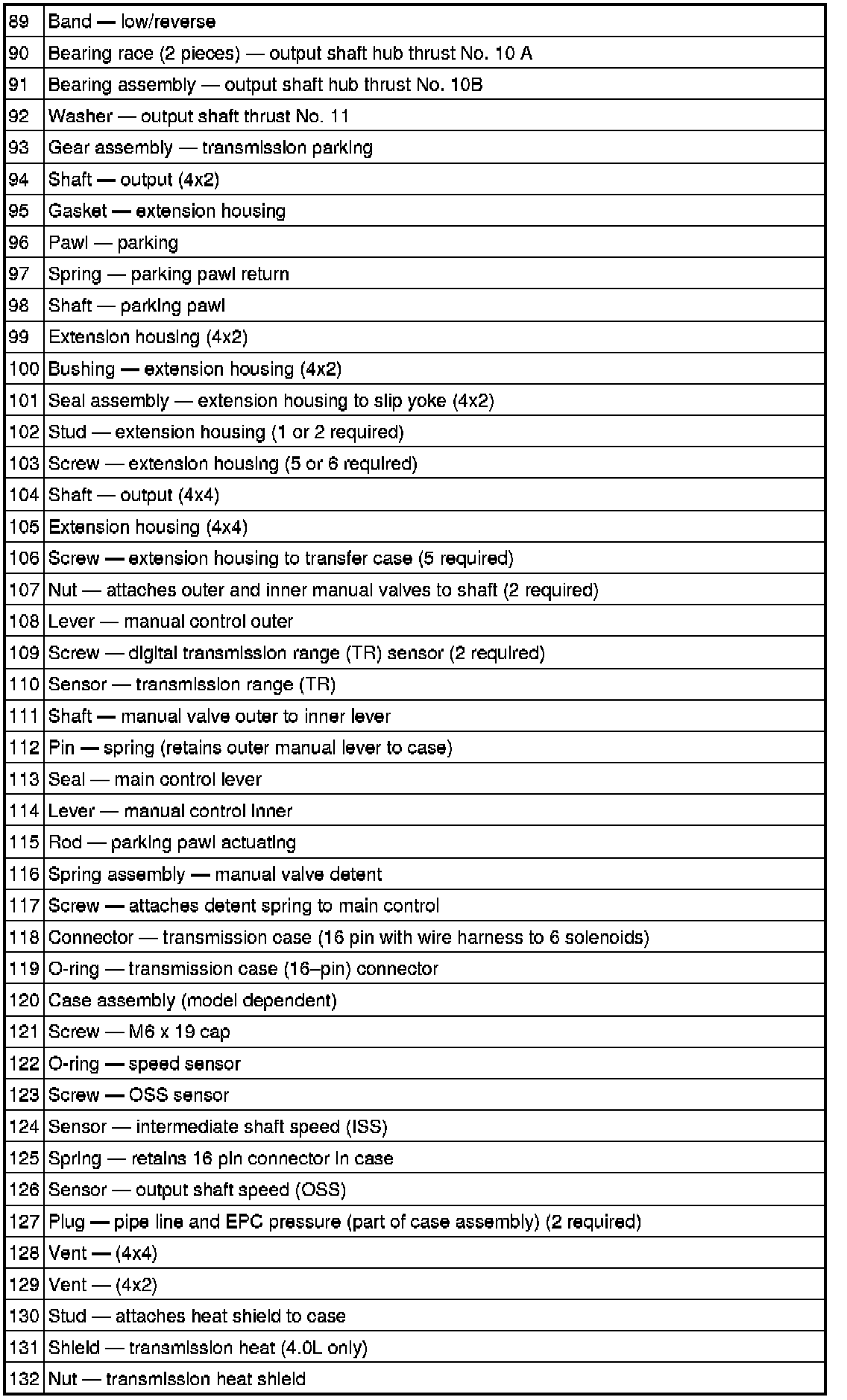 Power is transmitted from the torque converter to the planetary gearsets through the input shaft. Bands and clutches are used to hold and drive certain combinations of gearsets. This results in five forward ratios and one reverse ratio, which are transmitted to the output shaft and differential.
