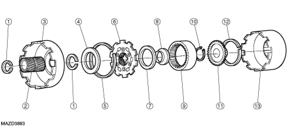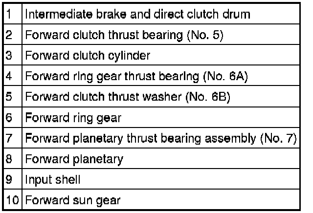 - The front planetary gearset carrier drives the center shaft via the overdrive one-way clutch in 1st, 2nd, and 3rd and 4th gears.