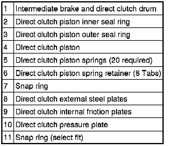 - The direct clutch is applied with hydraulic pressure and disengaged by return springs and the exhaust of the hydraulic pressure.