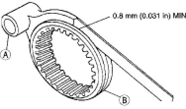 1. Check the contact surface of the (A) shift fork and (B) synchronizer sleeve for wear or damage.
