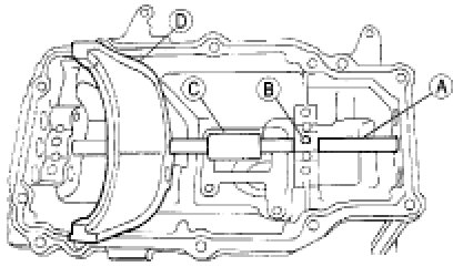 5. Position the (B) detent ball and spring, the (C) shift gate, the (D) shift fork and spring and install the (A) third/fourth shift rail.