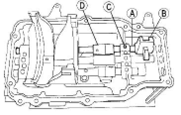 4. Position the (B) detent ball and spring, the (C) shift gate, the (D) shift fork and spring and install the (A) first/second shift rail.