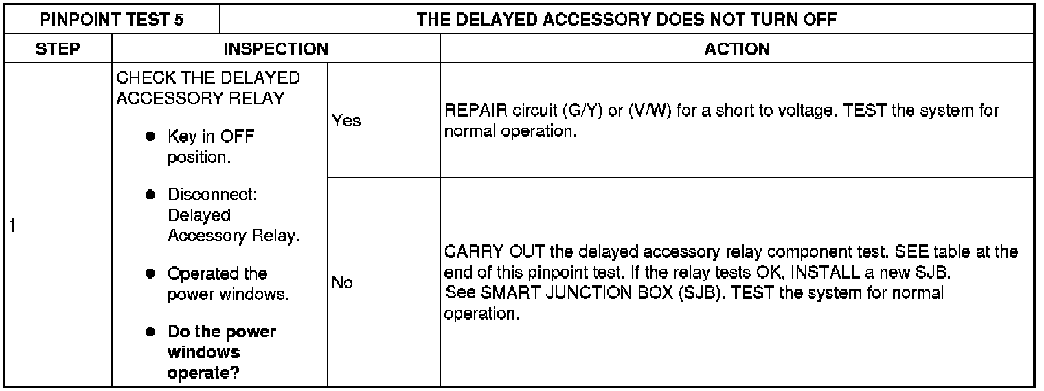 PINPOINT TEST 5: THE DELAYED ACCESSORY RELAY DOES NOT TURN OFF/ALL WINDOWS OPERATE WITH THE IGNITION IN THE OFF POSITION