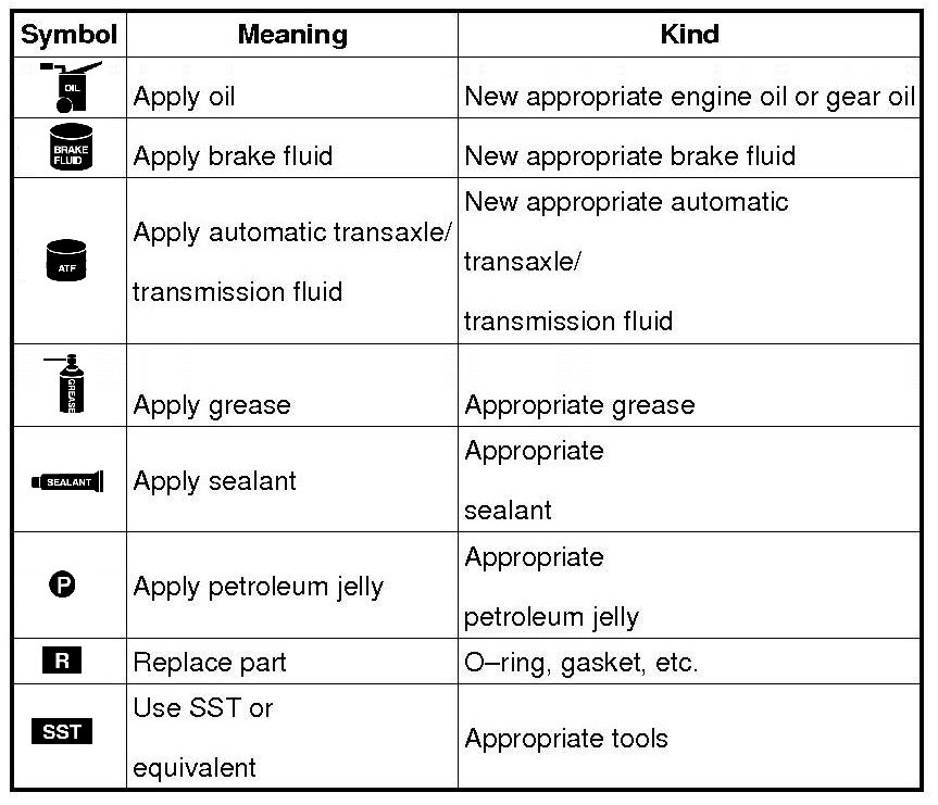 - There are eight symbols indicating oil, grease, fluids, sealant, and the use of SST or equivalent. use. These symbols show application points or use of these materials during service.