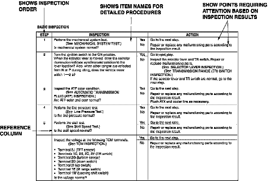 - Although inspections and adjustments are performed according to the reference column procedures, if the cause of the malfunction is discovered during basic inspection, continue the procedures as indicated in the action column.