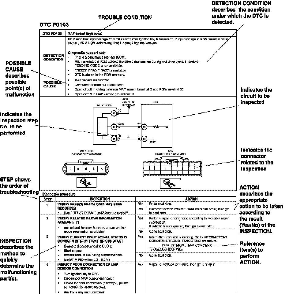- DTC troubleshooting flow shows diagnostic procedures, inspection methods, and proper action to take for each DTC.