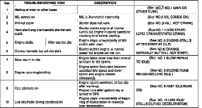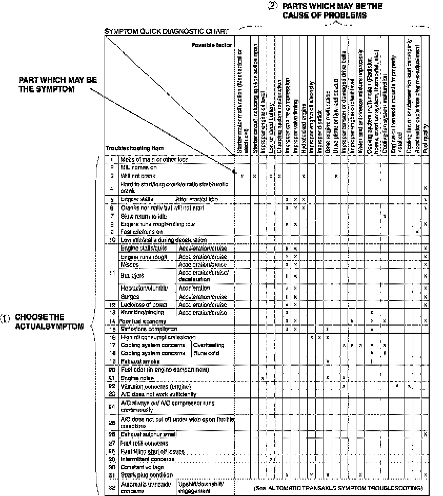 - The appropriate diagnostic inspection relating to a malfunction cause as specified by the symptoms can be selected by looking down the diagnostic inspection column of the chart.