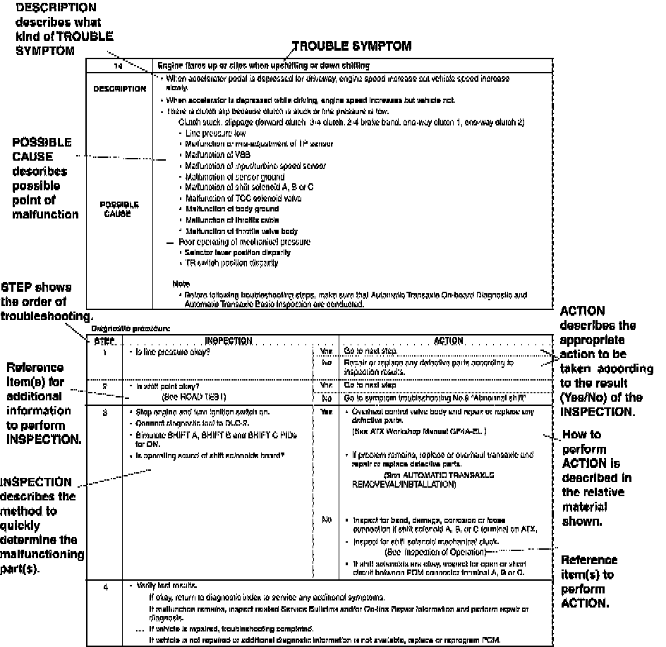 - Symptom troubleshooting shows diagnostic procedures, inspection methods, and proper action to be taken for each trouble symptom.