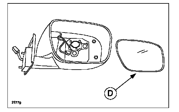 1. Remove the mirror glass (D) according to MS3 online or Workshop Manual (section 09-12 OUTER MIRROR GLASS REMOVAL). The mirror glass will be reused.