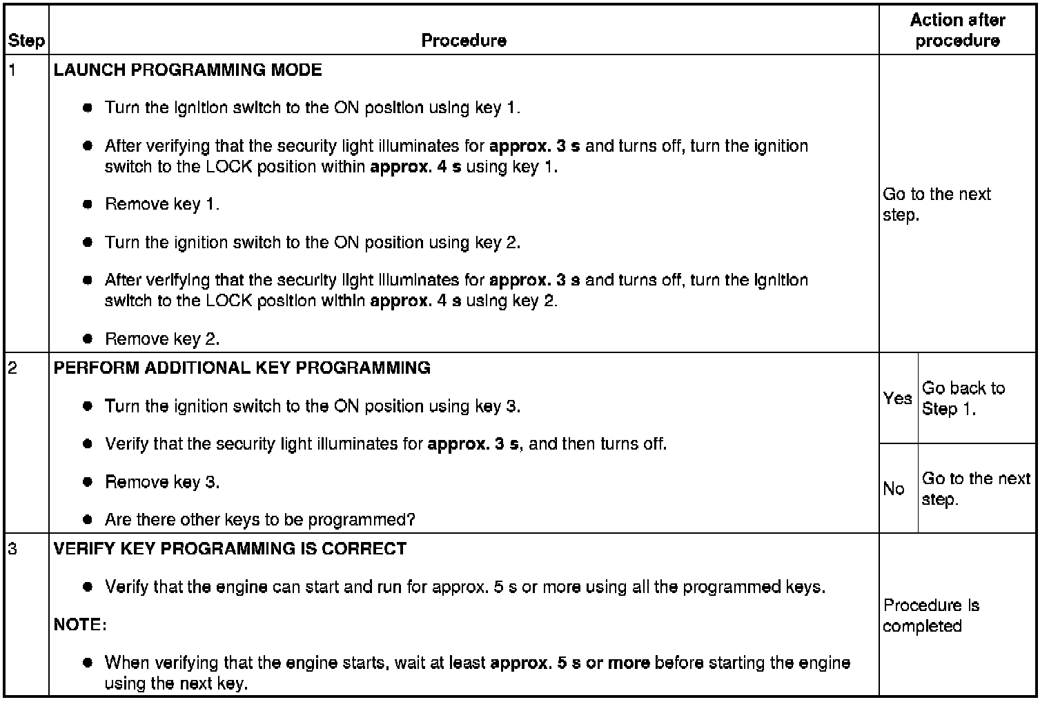 - If the engine is started during immobilizer system-related parts programming, the programming mode cancels. Therefore, do not start the engine unless indicated in the procedure. Repeat the procedure from the beginning if the engine is started during the immobilizer system-related parts programming.