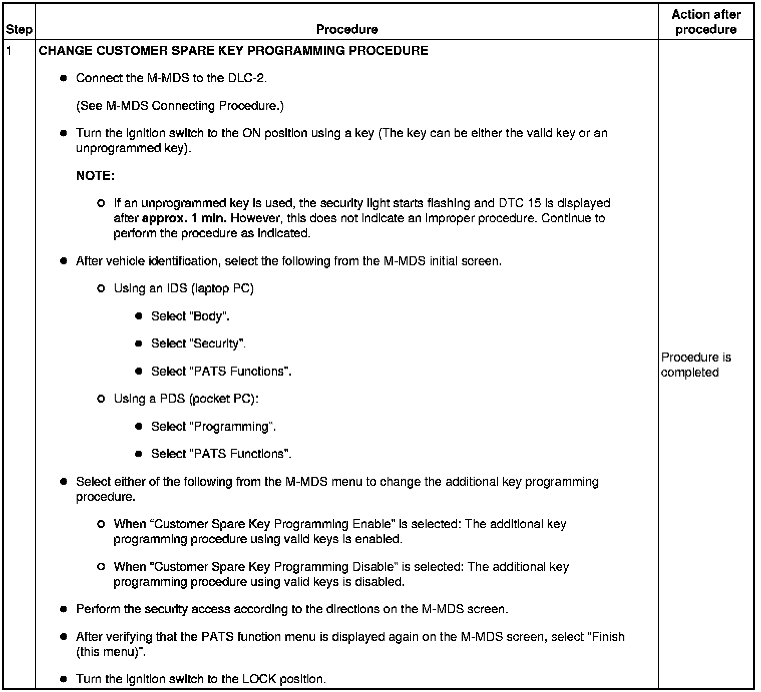 - If "Customer spare key programming disable" is selected, perform additional key programming using the M-MDS.
