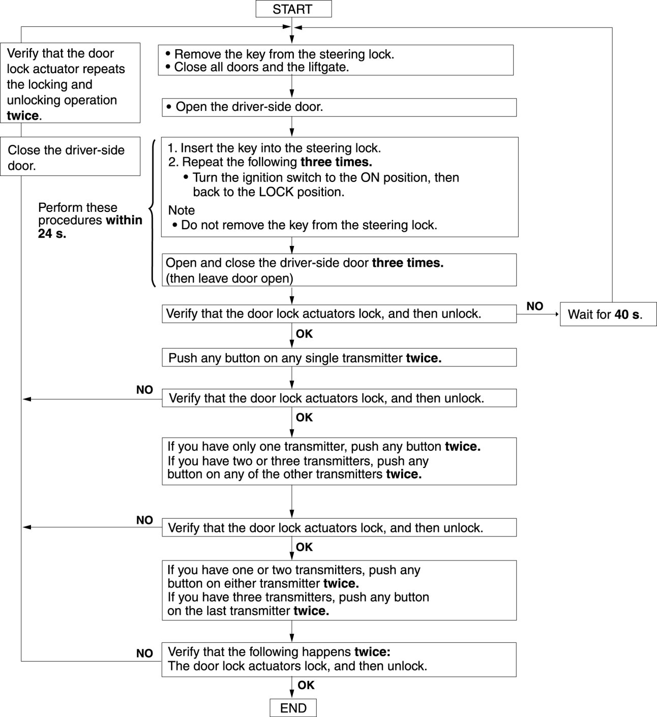 - After ID code programming, remove the key from the steering lock and verify that all doors lock/unlock normally using the transmitter.