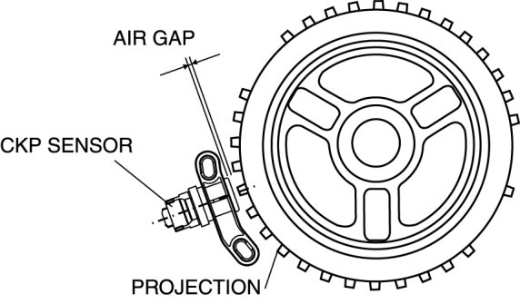 2. Using a thickness gauge, measure the air gap between the plate projections at the back of crankshaft pulley and the CKP sensor.