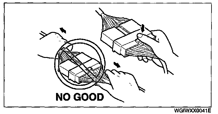 - When a tester is used to inspect for continuity or measuring voltage, insert the tester probe from the wiring harness side.