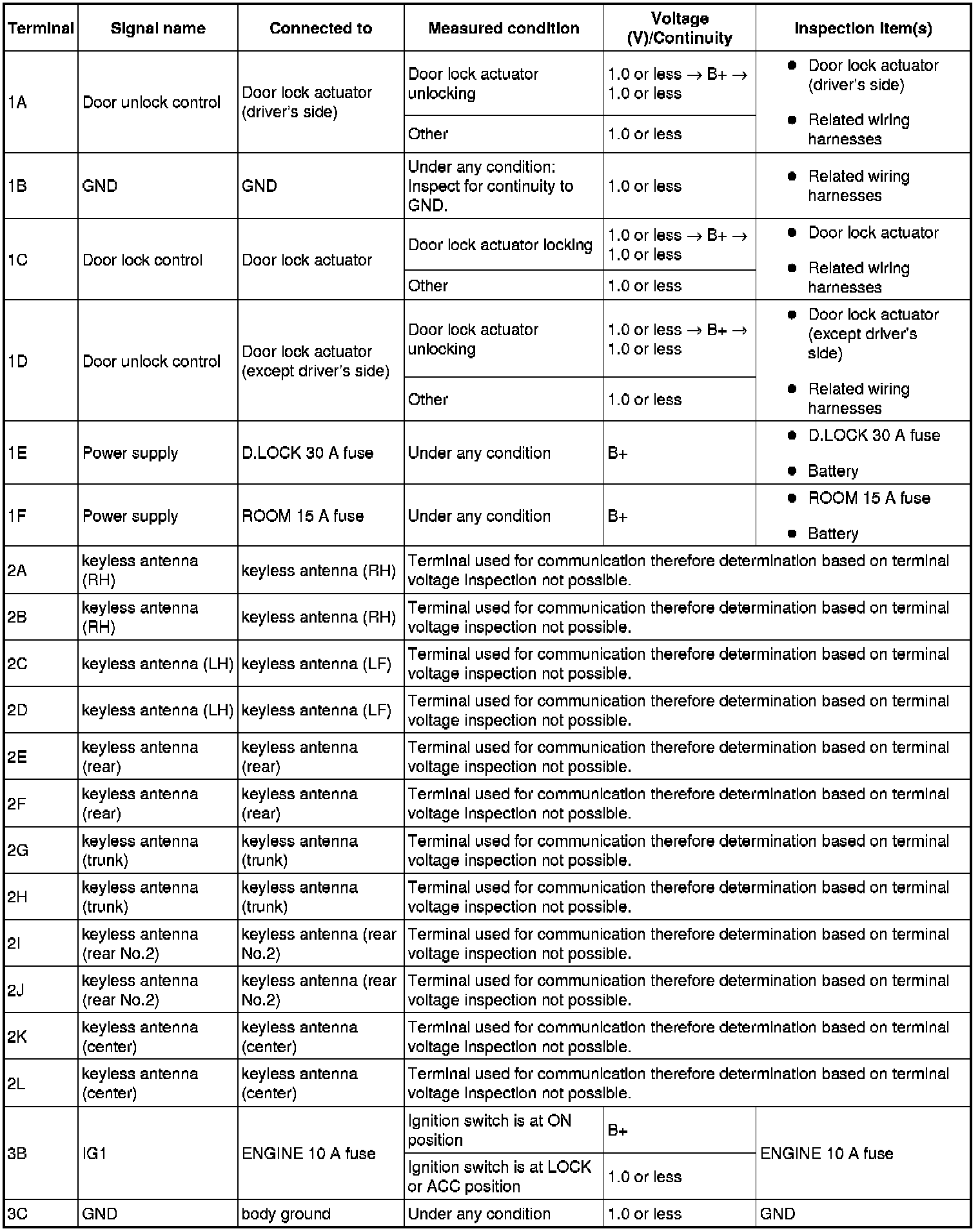 1. Measure the voltage or inspect for continuity according to the Terminal Voltage Table (Reference).
