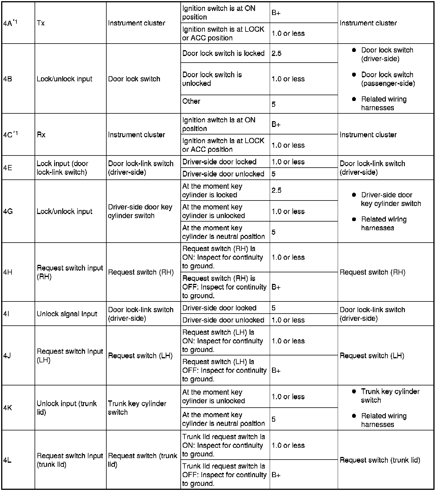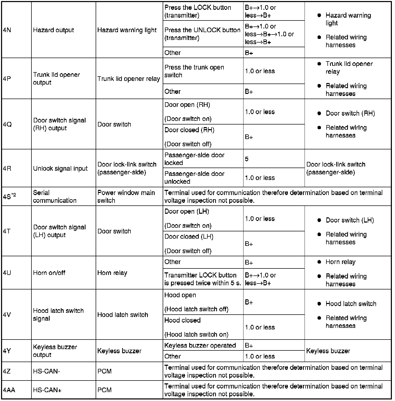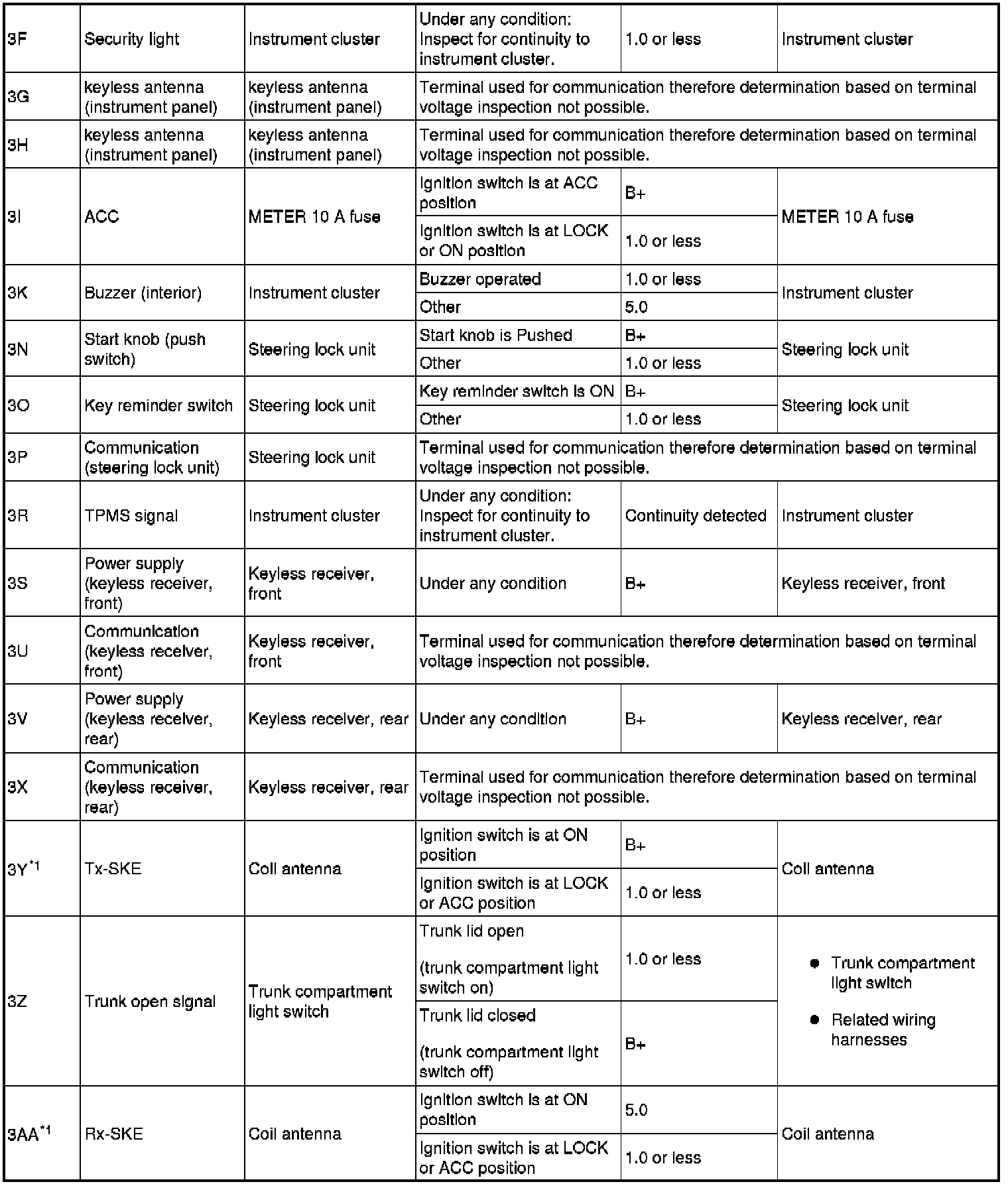 - If the voltage is not as specified in the Terminal Voltage Table (Reference), inspect the parts under "Inspection item(s)" and related wiring harnesses.