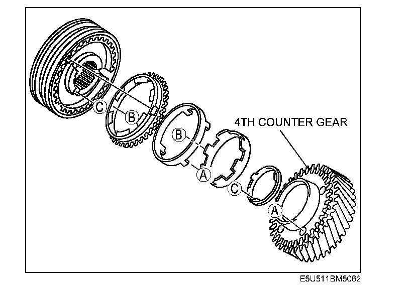 4th Counter Gear, 4th Synchronizer ring, 4th Bearing Inner Race Assembly Note1. Install the steel ball to the countershaft.