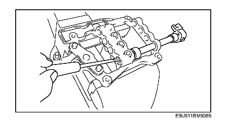 Caution: Do not forget to insert the interlock pins. Note: Insert the shift rod while pressing the detent ball with a flathead screwdriver as shown in the figure.