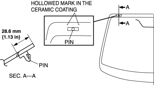 4. Align the marks made before removal and install the pin to the windshield referring to the figure. (when reusing the glass, and the pin was removed)