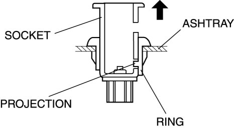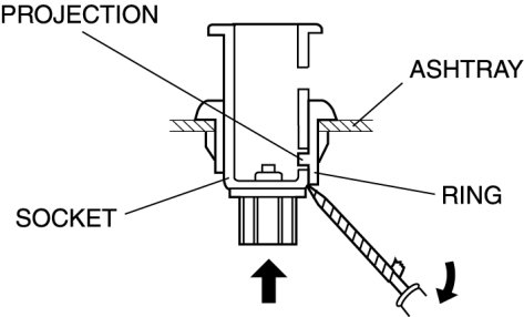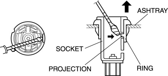 3. From the rear of the ashtray, insert a tape-wrapped flathead screwdriver between the socket and the ring as shown in the figure.