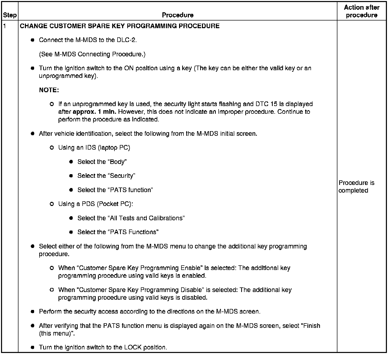 - If a key ID number cannot be programmed and DTC 15 is displayed, the maximum number of programmed keys may have been reached. Verify the number of programmed keys using the M-MDS.