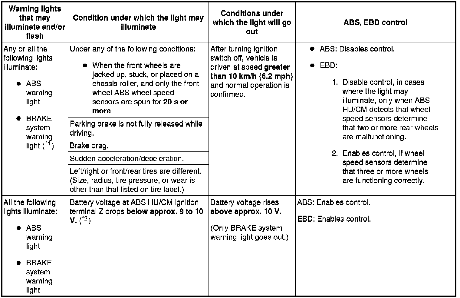 1. Any one or a combination of the ABS warning and BRAKE system warning lights illuminate even when the system is normal.