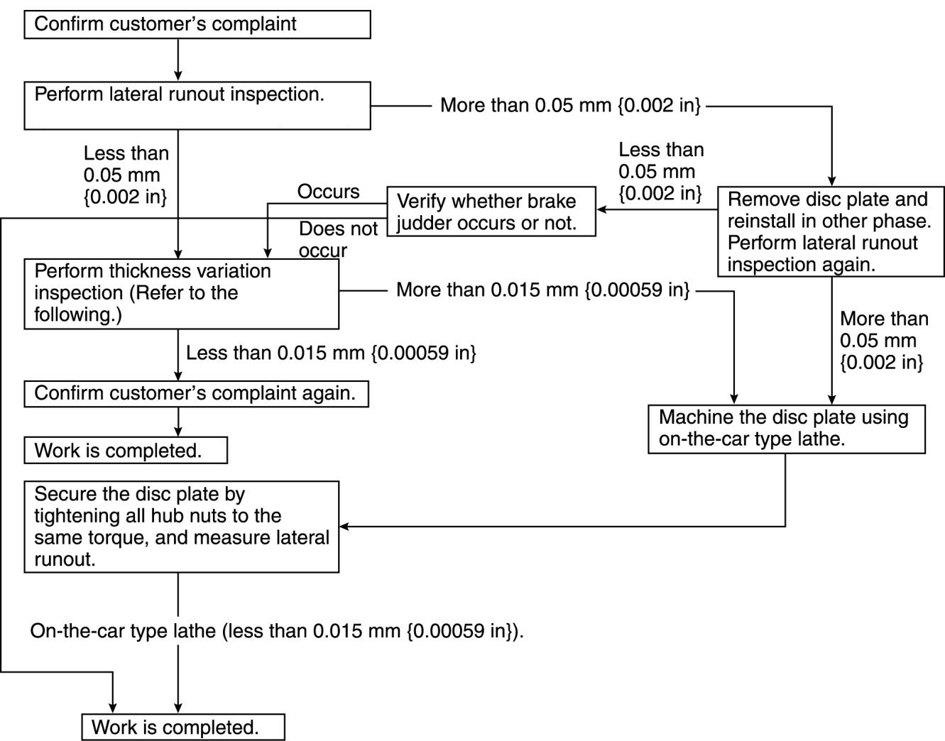 - If the runout is more than 0.05 mm {0.002 in} at the position 10 mm {0.39 in} from the disc plate edge, uneven wear occurs on the disc plate because the pad contacts the plate unevenly.